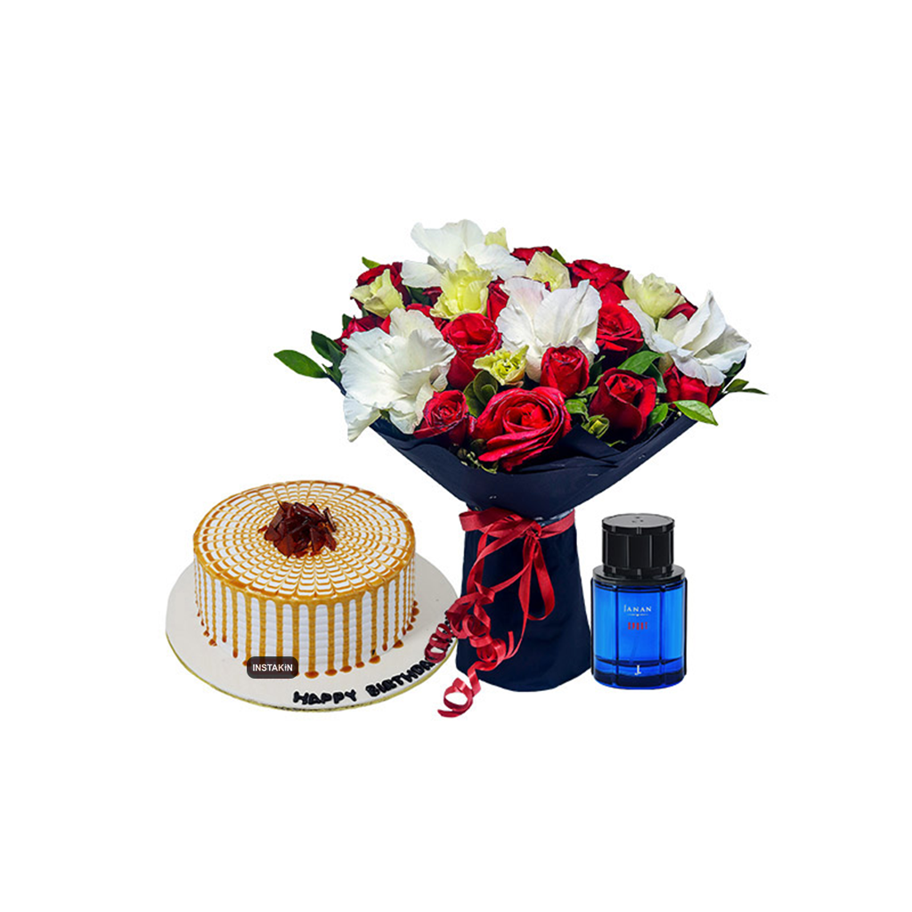 Celebrate the best day of the year with this handpicked flower bouquet from our best florists in town. A beautiful arrangement to make them feel special. This fantastic gift combo is paired with a caramel crunch cake and perfume.
