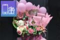 A pink-violet-themed gift basket consisting of imported flowers, wrapped assorted chocolates, balloons, and a teddy bear.