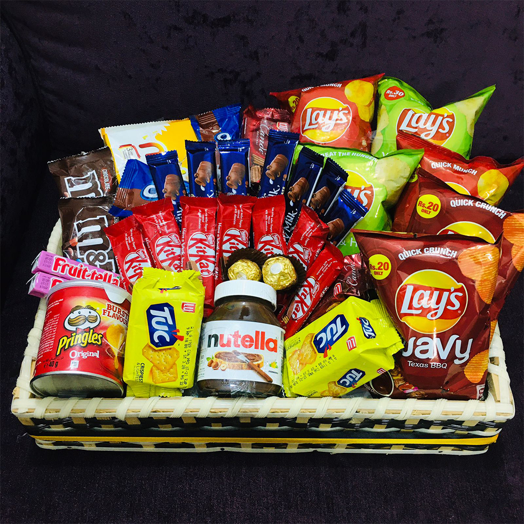 An elegant and tasteful gift basket filled with different flavours of lays chips, kitkats, dairy milk chocolates with candy, tuc, oreo biscuits, a bottle of nutella chocolate and M&Ms and much more.