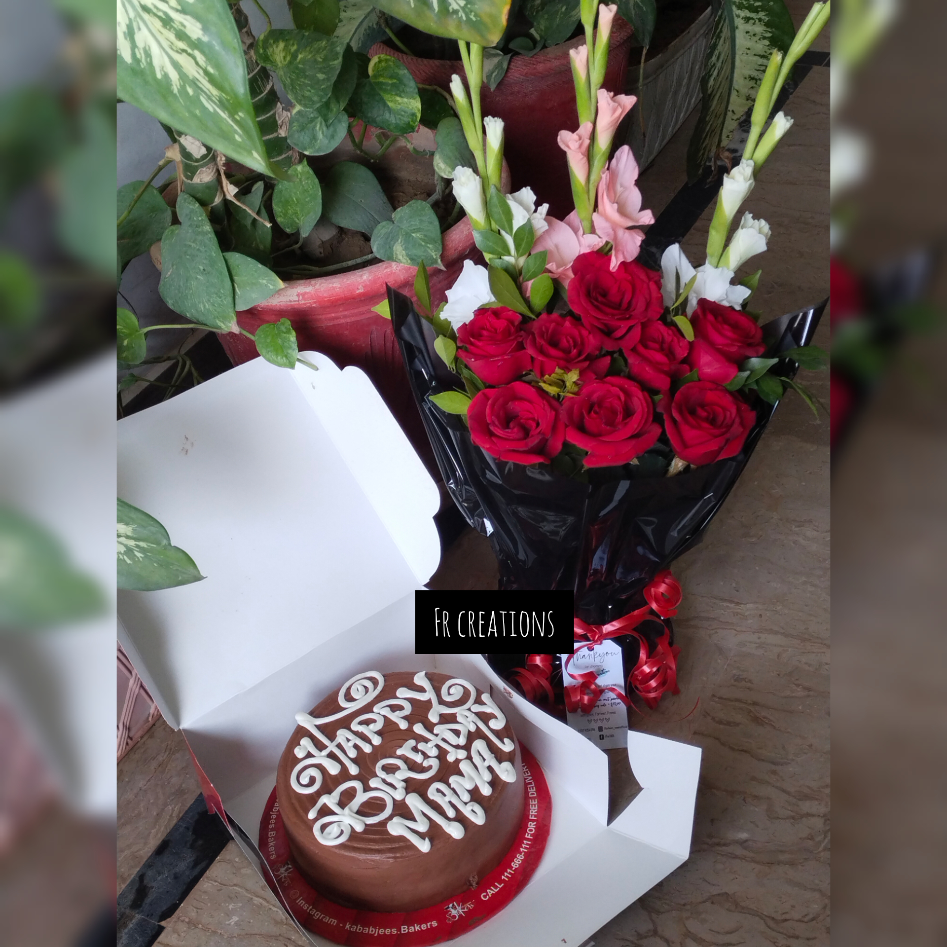Freshly baked delicious 2 lbs chocolate cake procured from a well-known bakery of the town comes along a beautiful red roses bouquet.