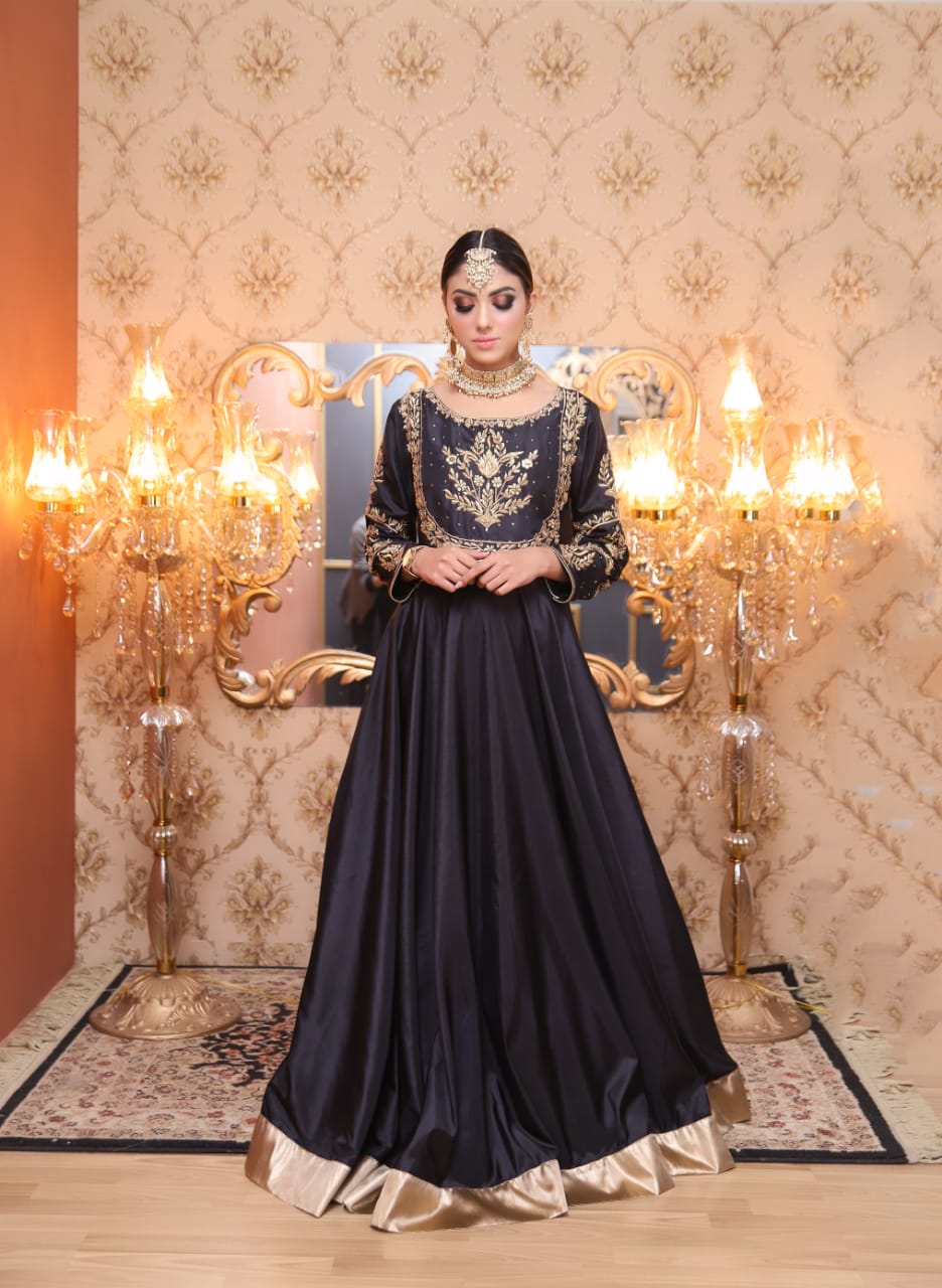 Black organza shirt with flared net gharara and mukesh net dupatta.