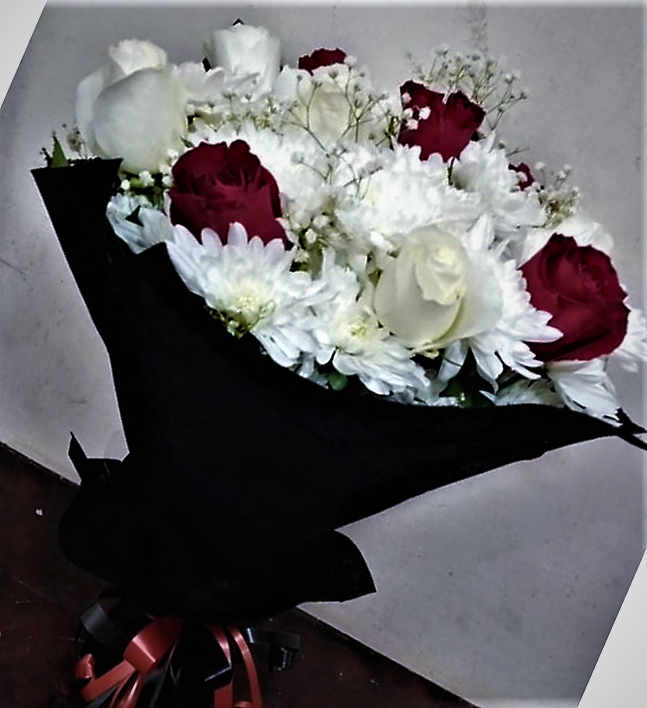 A selection of hand-picked imported red and white roses arranged with chrysanthemum flowers wrapped in beautiful jute.