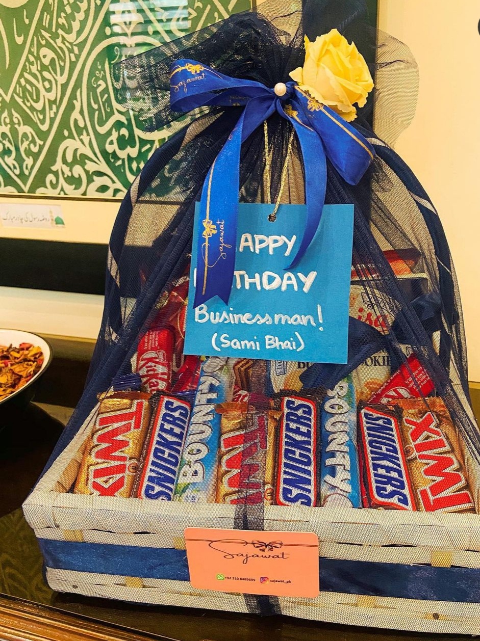 This gift basket includes Wavy, lays, danissa butter cookie, & kitkat, bounty, twix, snickers chocolates.